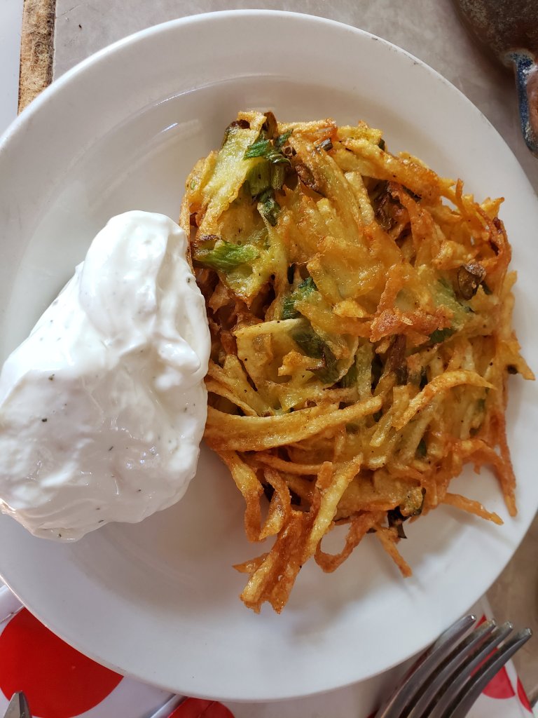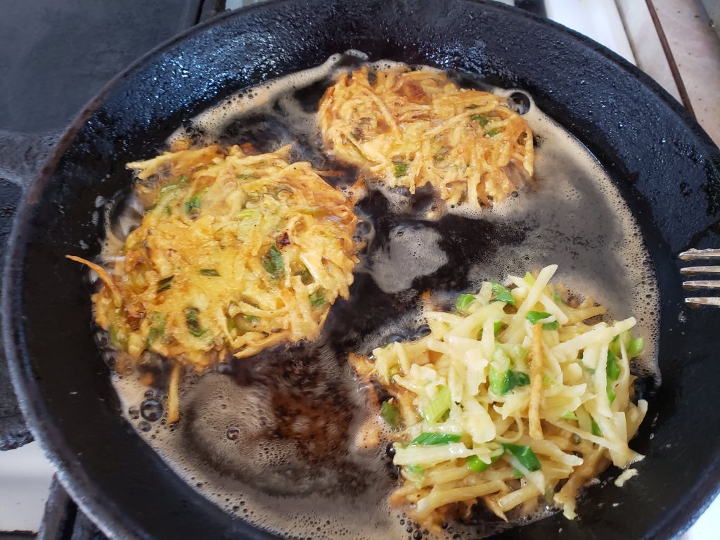 I grated potatoes into water, to avoid oxidation. I drained them and wrung them dry. I added minced scallions, an egg, just a bit of salt and pepper and some flour, and then heated oil in a cast-iron skilled.