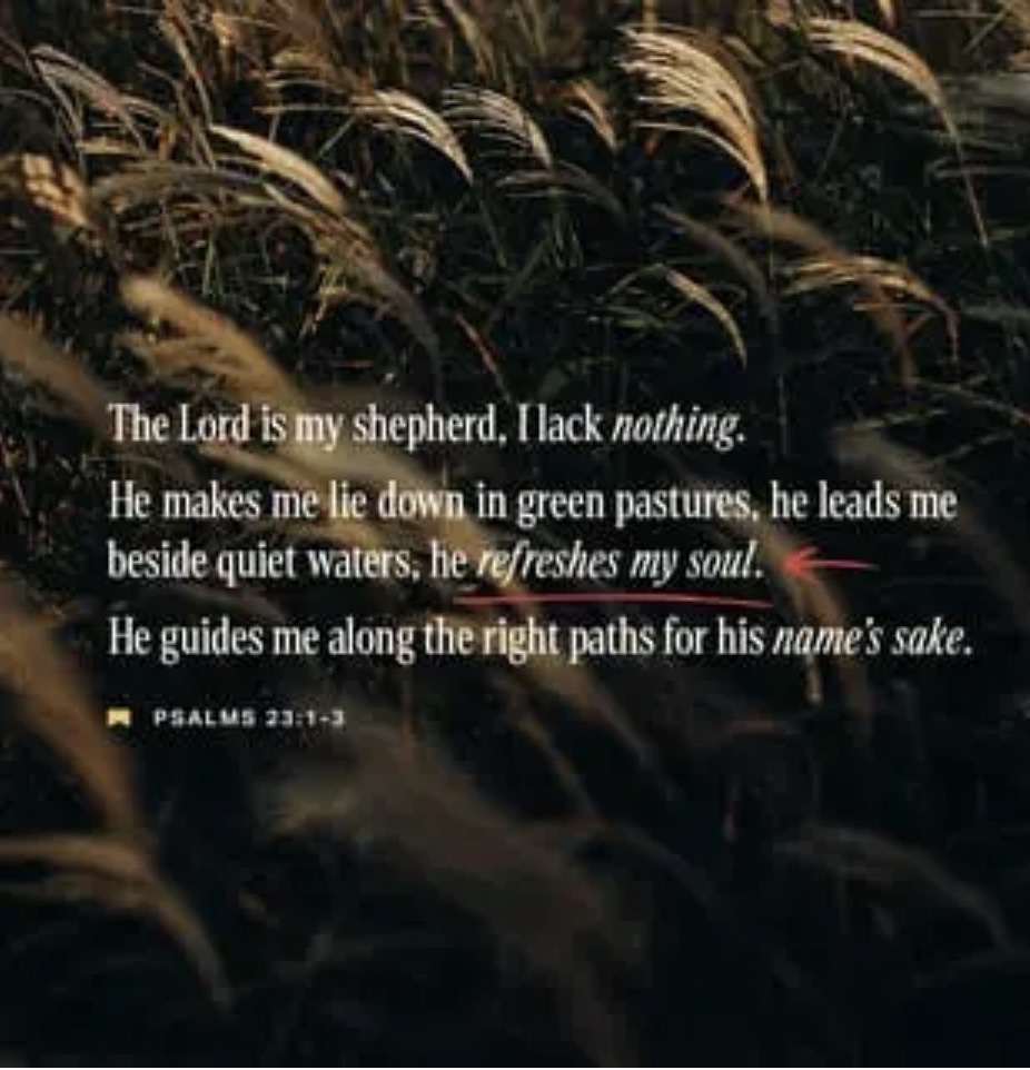 “You, Lord, are my shepherd. I will never be in need. You let me rest in fields of green grass. You lead me to streams of peaceful water, and you refresh my life. You are true to your name, and you lead me along the right paths. I may walk through valleys as dark as death, but I won’t be afraid. You are with me, and your shepherd’s rod makes me feel safe. You treat me to a feast, while my enemies watch. You honor me as your guest, and you fill my cup until it overflows. Your kindness and love will always be with me each day of my life, and I will live forever in your house, Lord.”